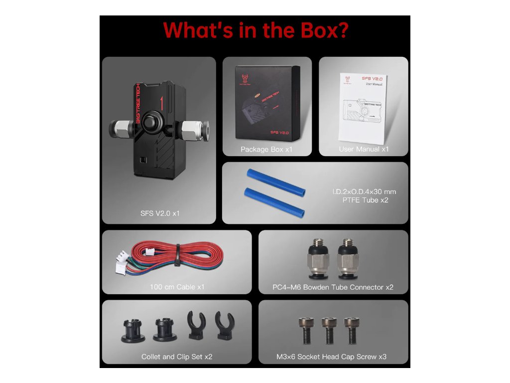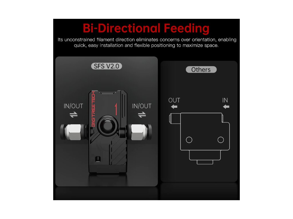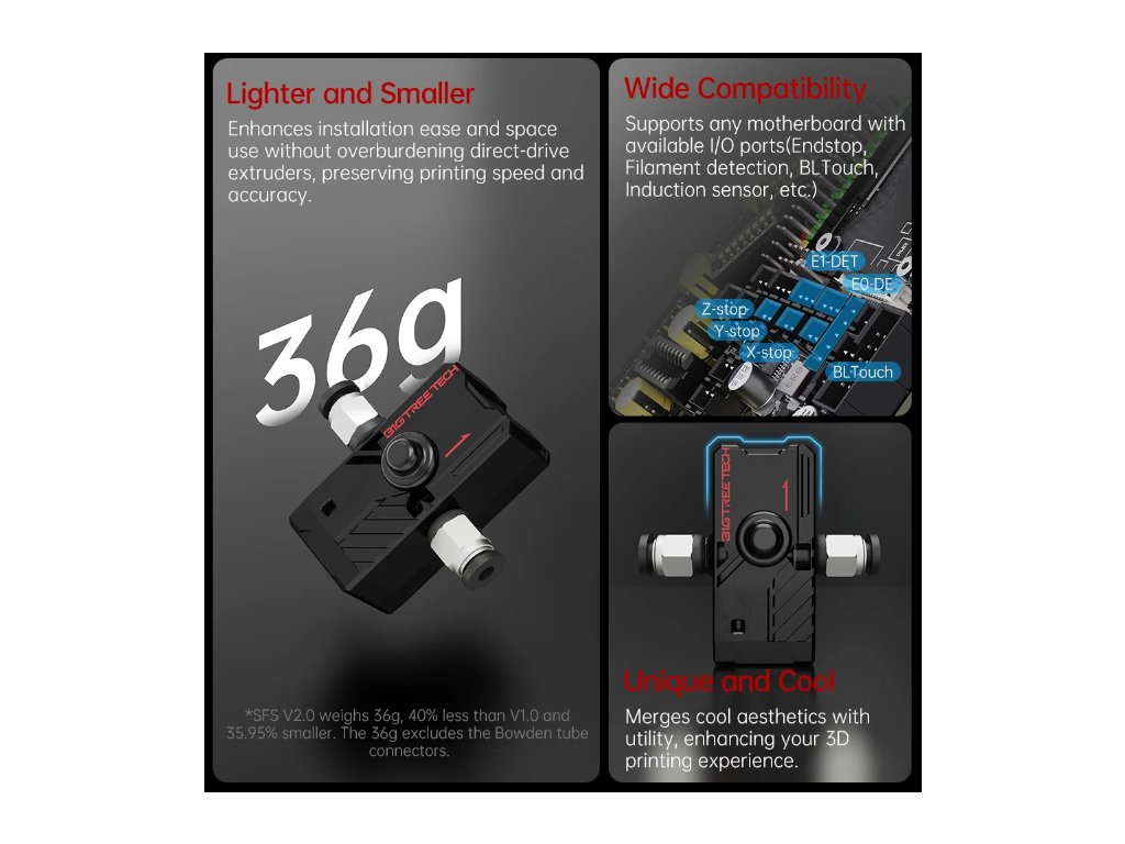 SFS V2.0 je inteligentní modul pro detekci filamentu pro FDM 3D tiskárny. SFS V2.0 je obousměrný, neexistuje tedy žádné omezení směru vlákna, což uživatelům poskytuje větší flexibilitu během instalace. Kompaktní, lehký a snadno se instaluje. Pracuje s bowdenovými a přímými extrudéry.