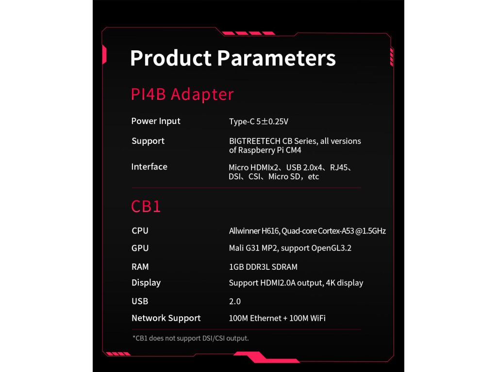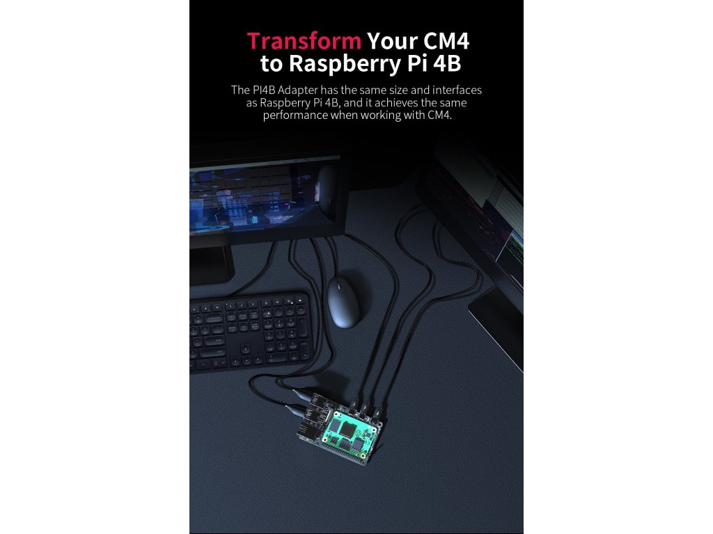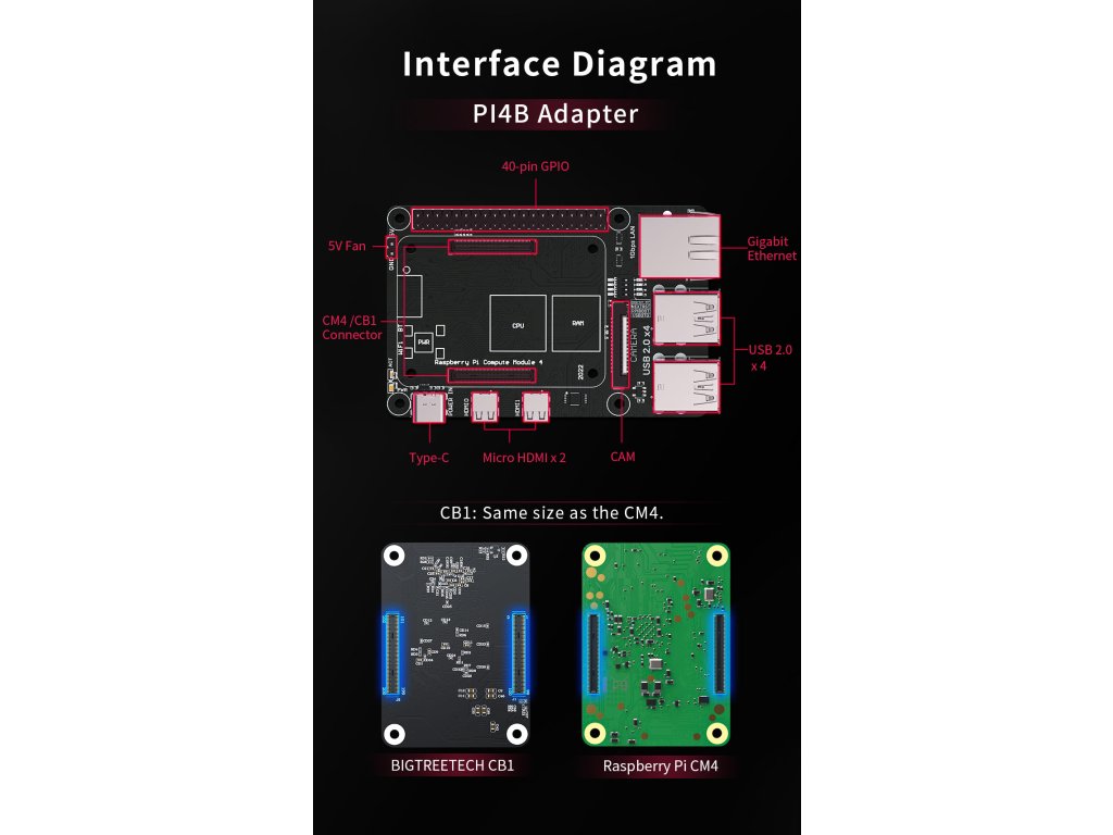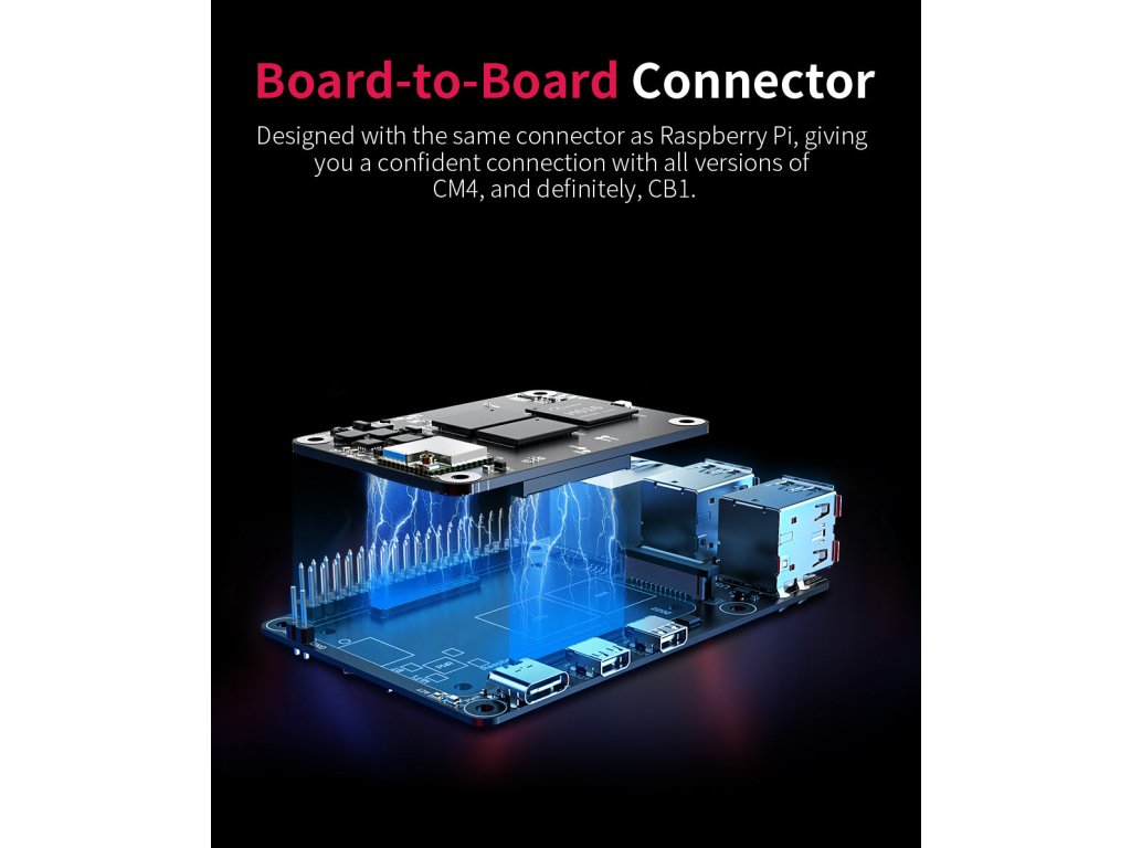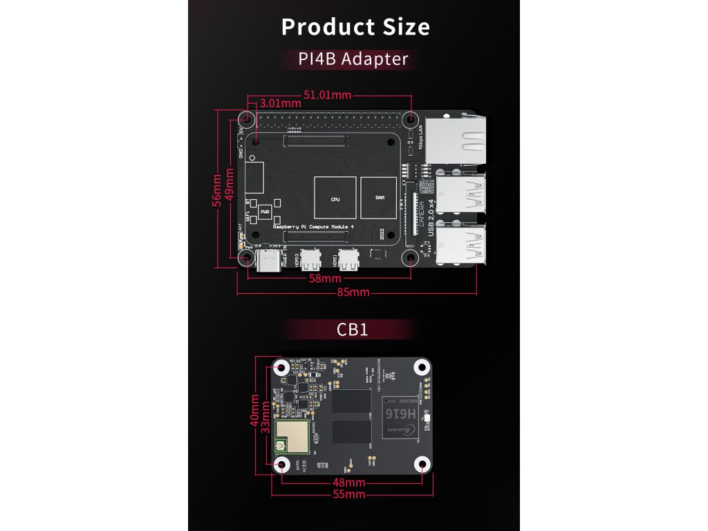 Adaptér umožňuje, spolu s mikropočítačem CB1, vytvoření alternativy k Raspberry Pi4B. Takový sestava má stejné rozměry, montážní otvory i konektory