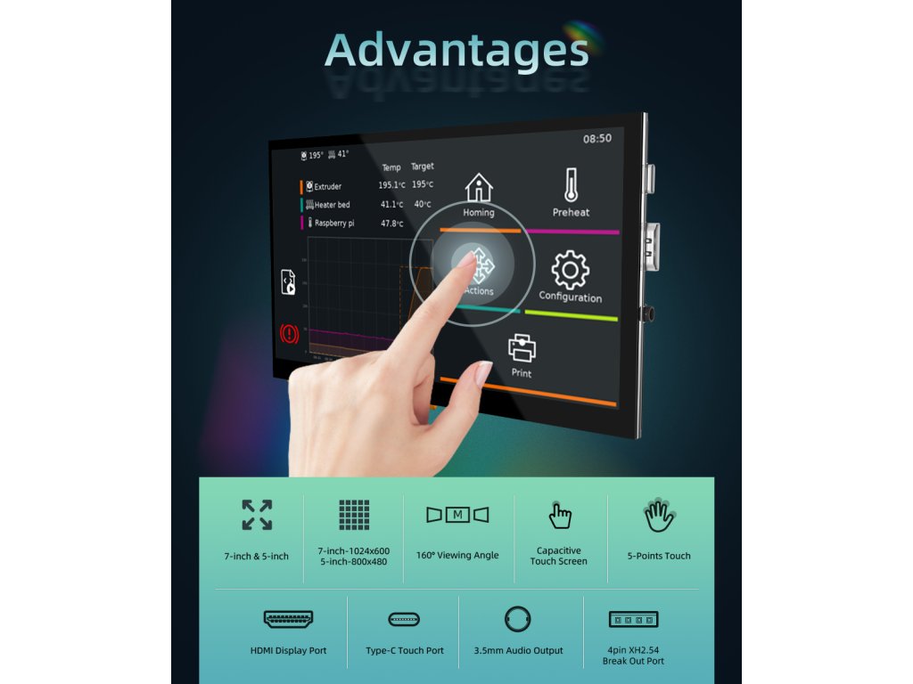 Plug and Play. Schließen Sie den Bildschirm einfach über den HDMI-Port an das Gerät an und versorgen Sie den Typ-C-Anschluss mit Strom, damit er ohne Treiberinstallation funktioniert. Dieser Bildschirm ist ideal für Benutzer von 3D-Druckern, die ihre Projekte erstellen können, und ist perfekt kompatibel mit dem Mainboard der Manta-Serie plus CB1.