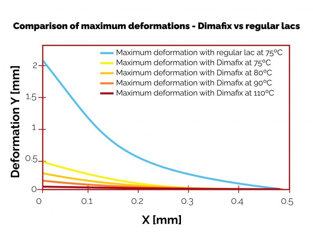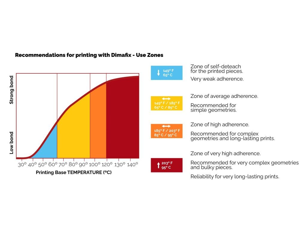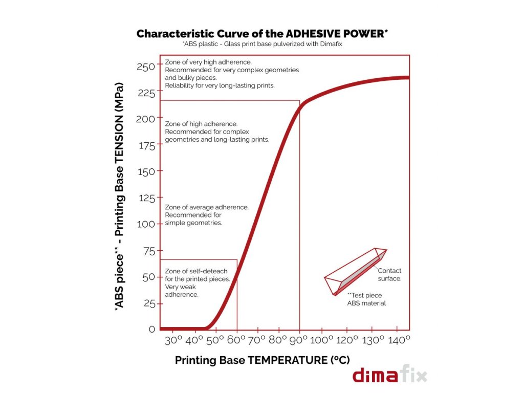 Dimafix chrání před nežádoucím odtržením modelu od tiskového stolu, a to i u těch nejnáročnějších vláken. Adhezivní vlastnosti přípravku se mění v závislosti na teplotě. Na příkladu ABS termoplastu můžeme rozlišit čtyři teplotní rozsahy provozu Dimafix: