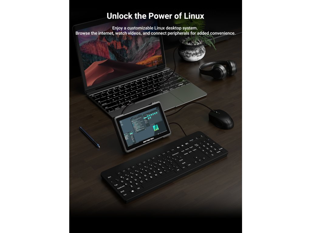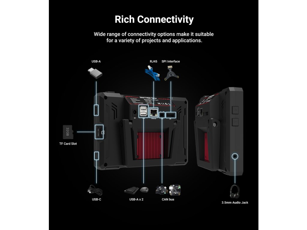 Various Interfaces. The tablet supports various interfaces such as USB 2.0, Ethernet, CAN, and SPI, and comes with a SanDisk 32 GB memory card for storage.