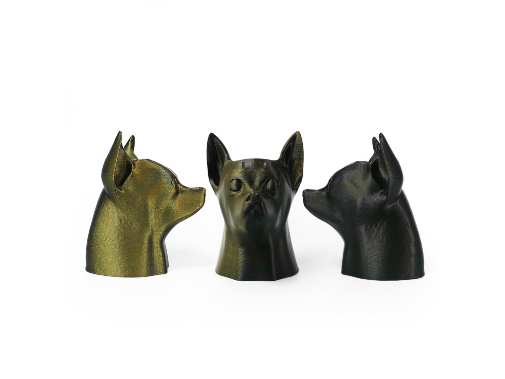 Filament má v řezu dvě barvy. Vytisknutý objekt má na jedné polovině jednu barvu a na druhé polovině druhou barvu.
