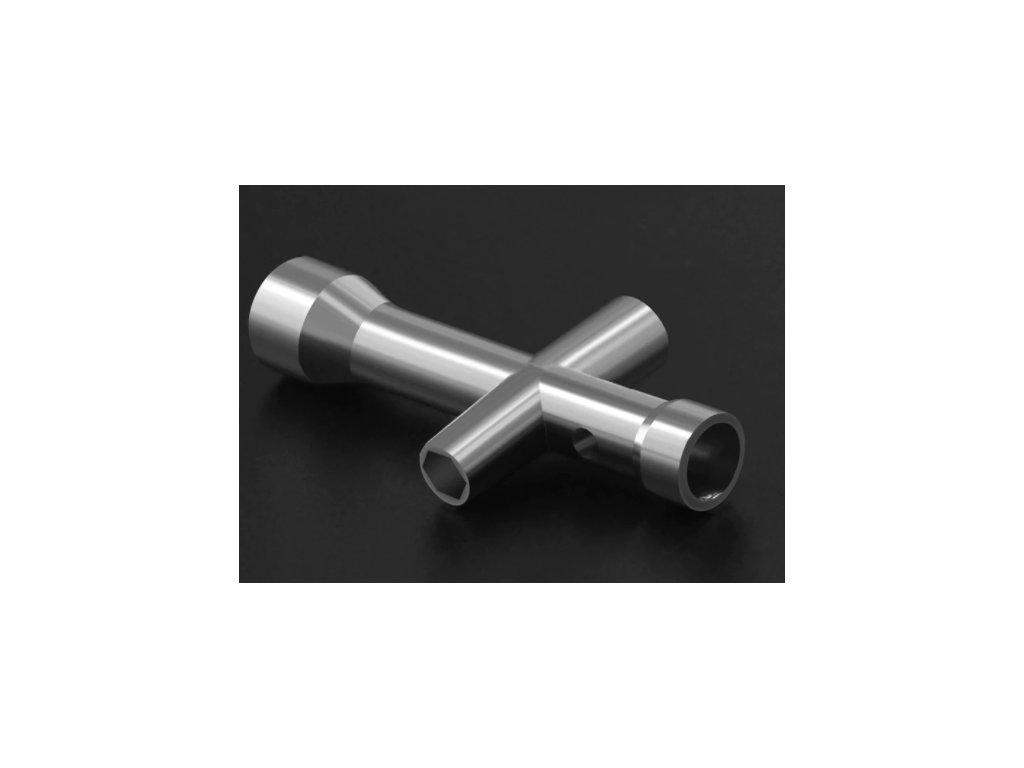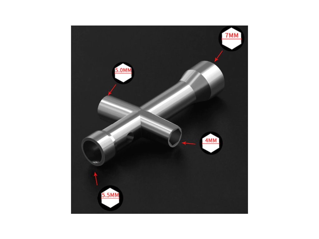 Univerzální, křížový klíč s rozměry 4 mm, 5 mm, 5,5 mm a 7 mm.