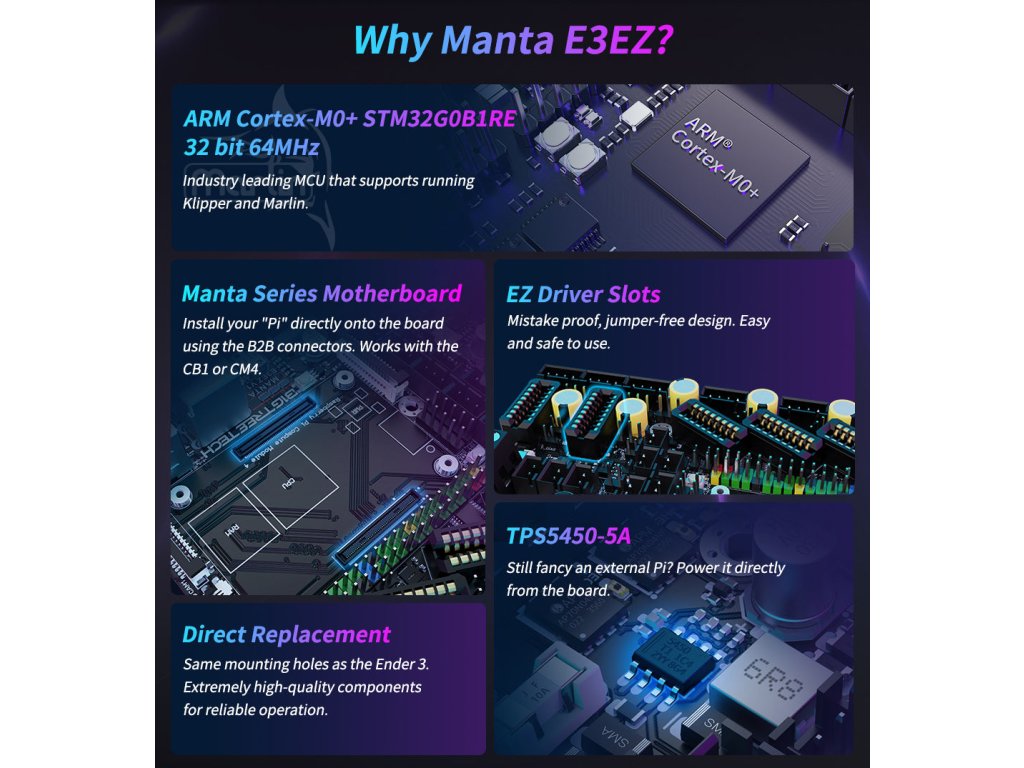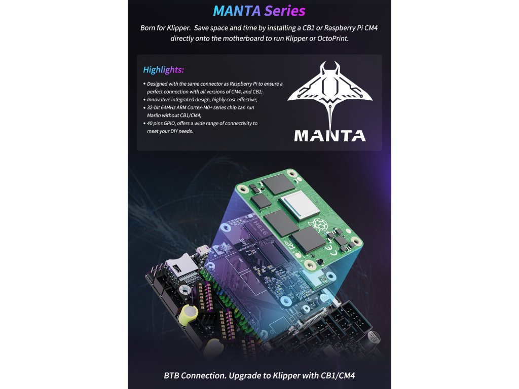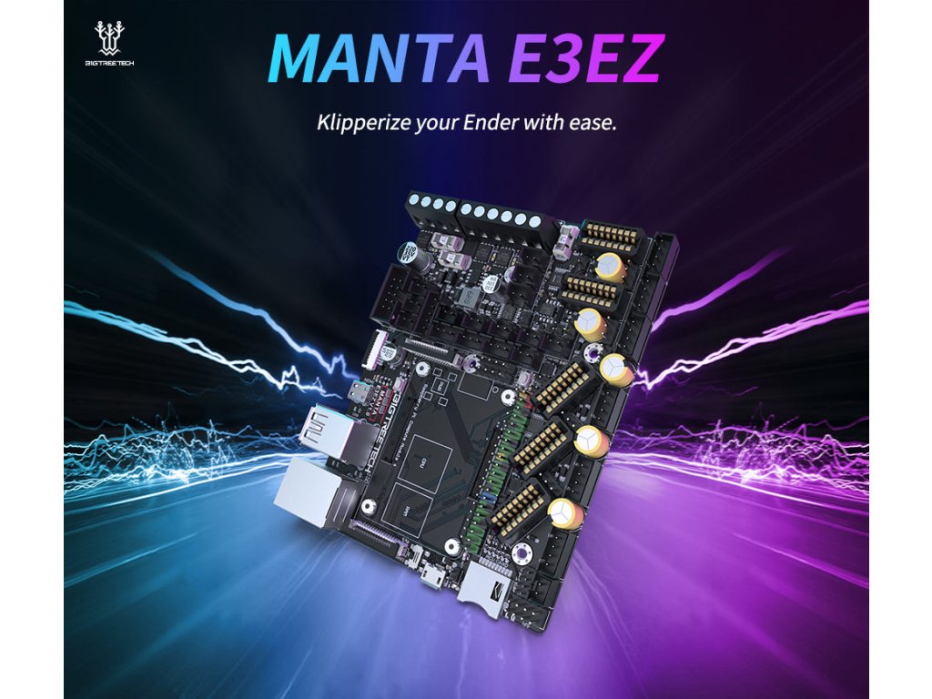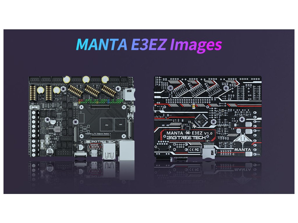 BIGTREETECH MANTA E3EZ V1.0 je základní deska vyvinutá týmem 3D tisku společnosti Shenzhen Bigtree Technology Co., která vám pomůže posunout váš Ender 3 na vyšší úroveň, ať už to znamená provozovat Klipper nebo dokonce Marlin se všemi nejnovějšími funkcemi. Jedná se o první základní desku, která obsahuje technologii "Manta" (konektory B2B pro moduly CB1 nebo CM4) a technologii "EZ" (možnost používat nejnovější ovladače EZ). Stačí zapojit základní desku CB1 a ovladače EZ na základní desce a upgradovat tiskárnu Ender 3 pro provoz systému Klipper. Díky tomu, že není potřeba externí Raspberry Pi, vám řada Manta ušetří nepřehlednou kabeláž a výsledkem je velmi kompaktní implementace.