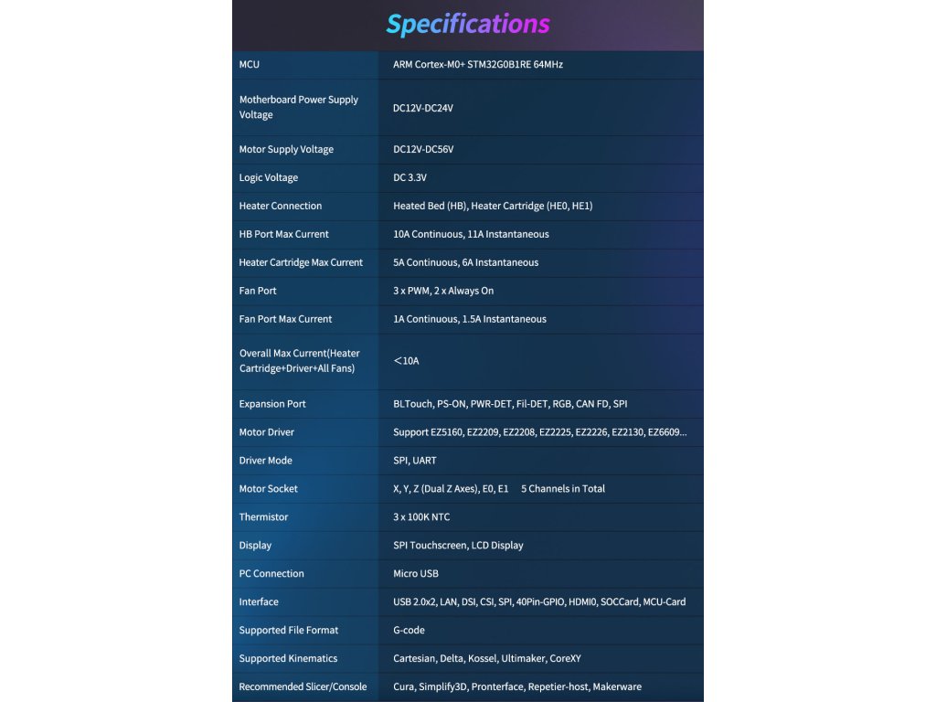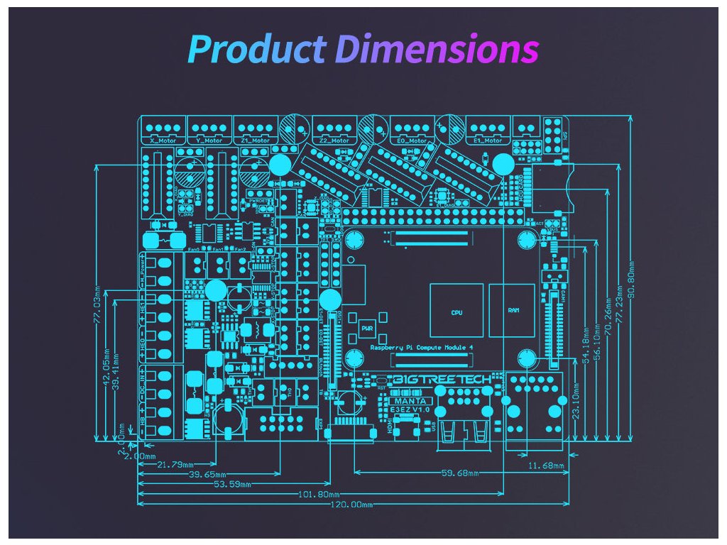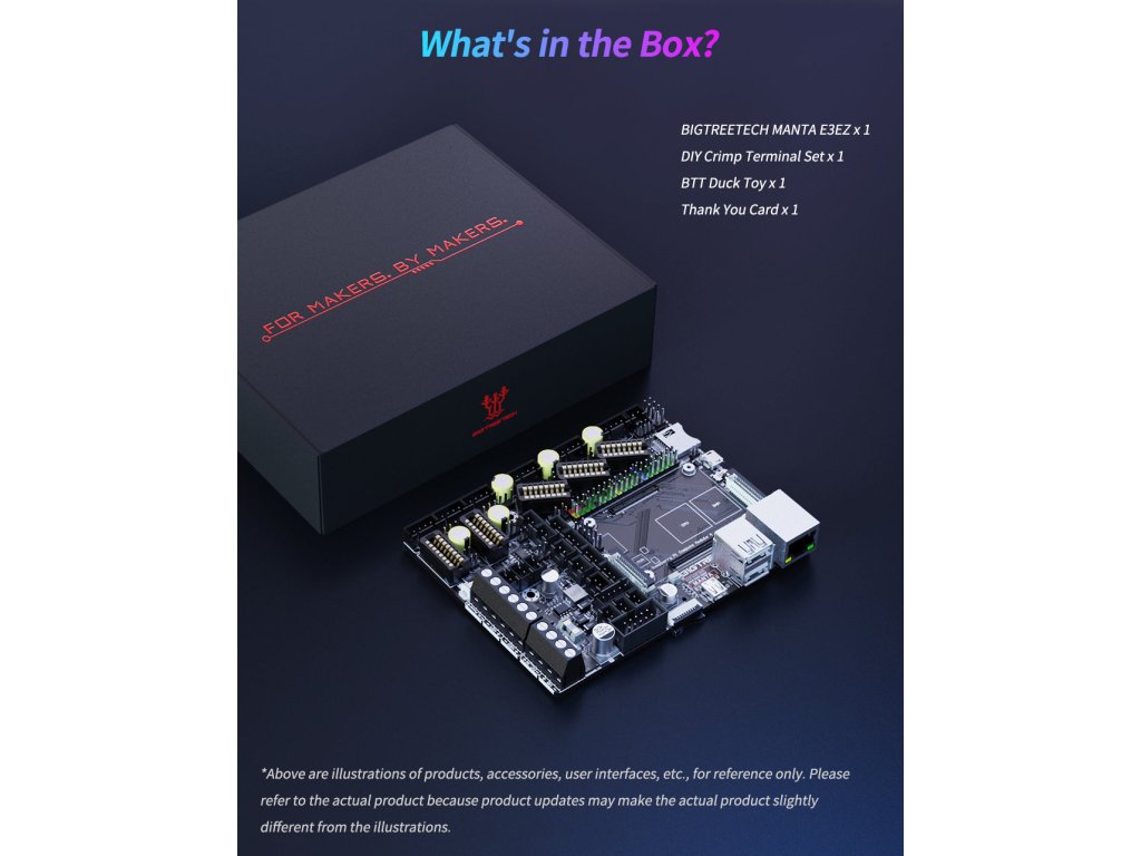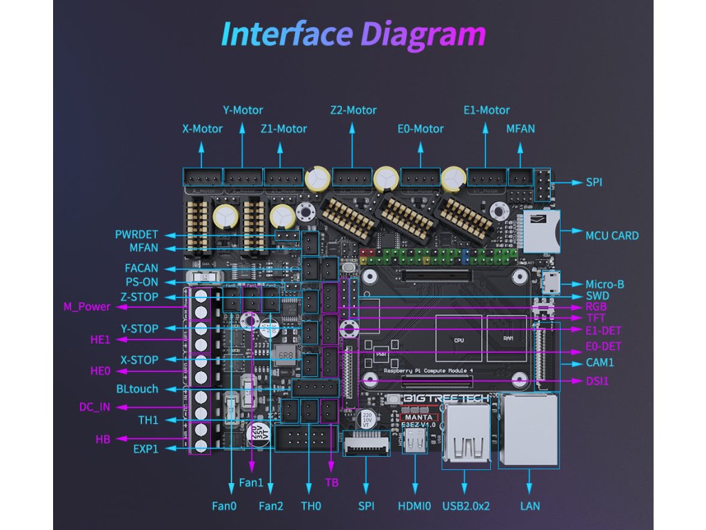 BIGTREETECH MANTA E3EZ V1.0 je základní deska vyvinutá týmem 3D tisku společnosti Shenzhen Bigtree Technology Co., která vám pomůže posunout váš Ender 3 na vyšší úroveň, ať už to znamená provozovat Klipper nebo dokonce Marlin se všemi nejnovějšími funkcemi. Jedná se o první základní desku, která obsahuje technologii "Manta" (konektory B2B pro moduly CB1 nebo CM4) a technologii "EZ" (možnost používat nejnovější ovladače EZ). Stačí zapojit základní desku CB1 a ovladače EZ na základní desce a upgradovat tiskárnu Ender 3 pro provoz systému Klipper. Díky tomu, že není potřeba externí Raspberry Pi, vám řada Manta ušetří nepřehlednou kabeláž a výsledkem je velmi kompaktní implementace.