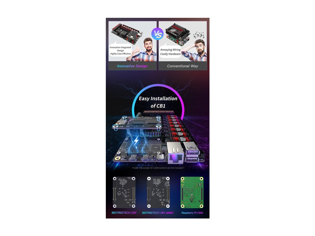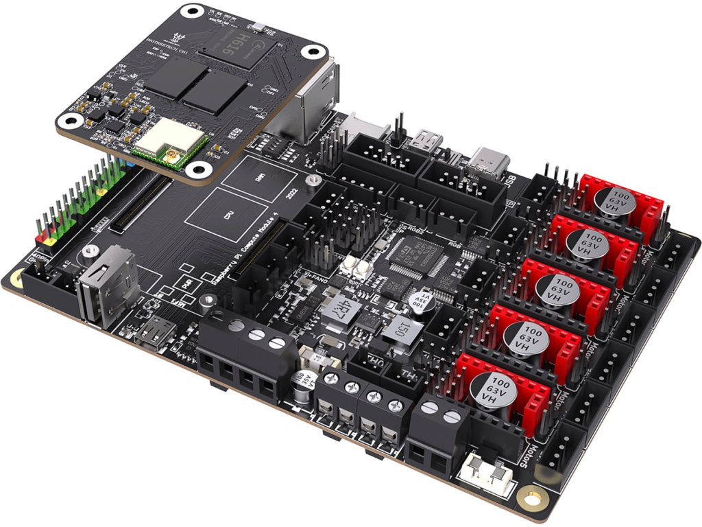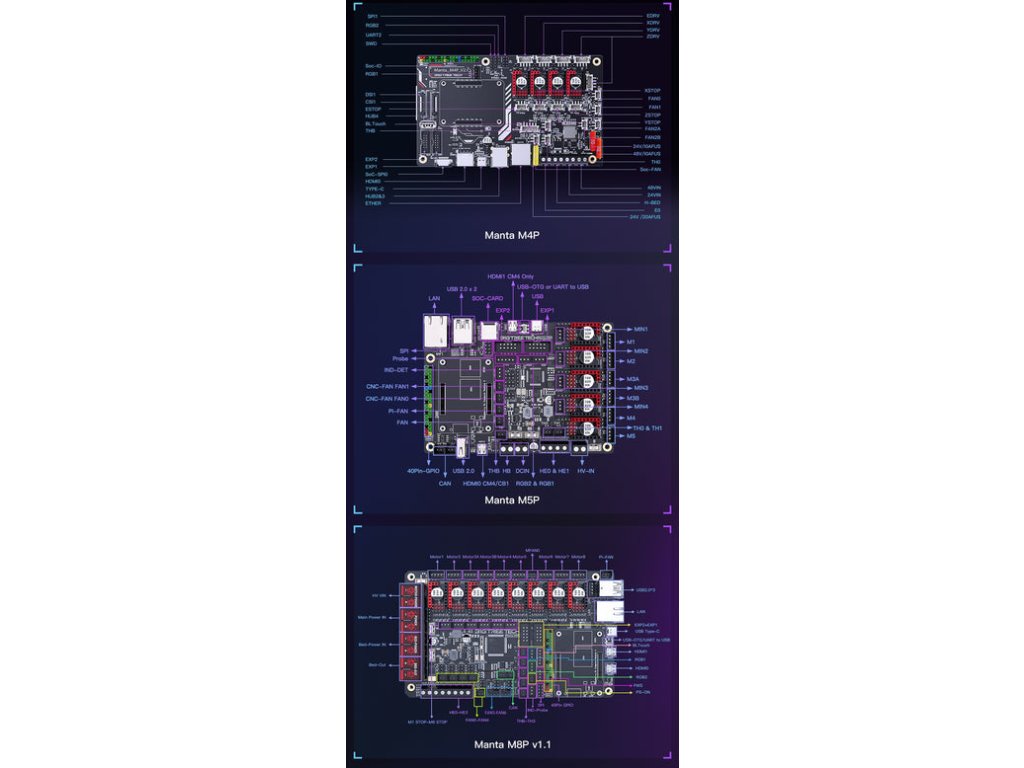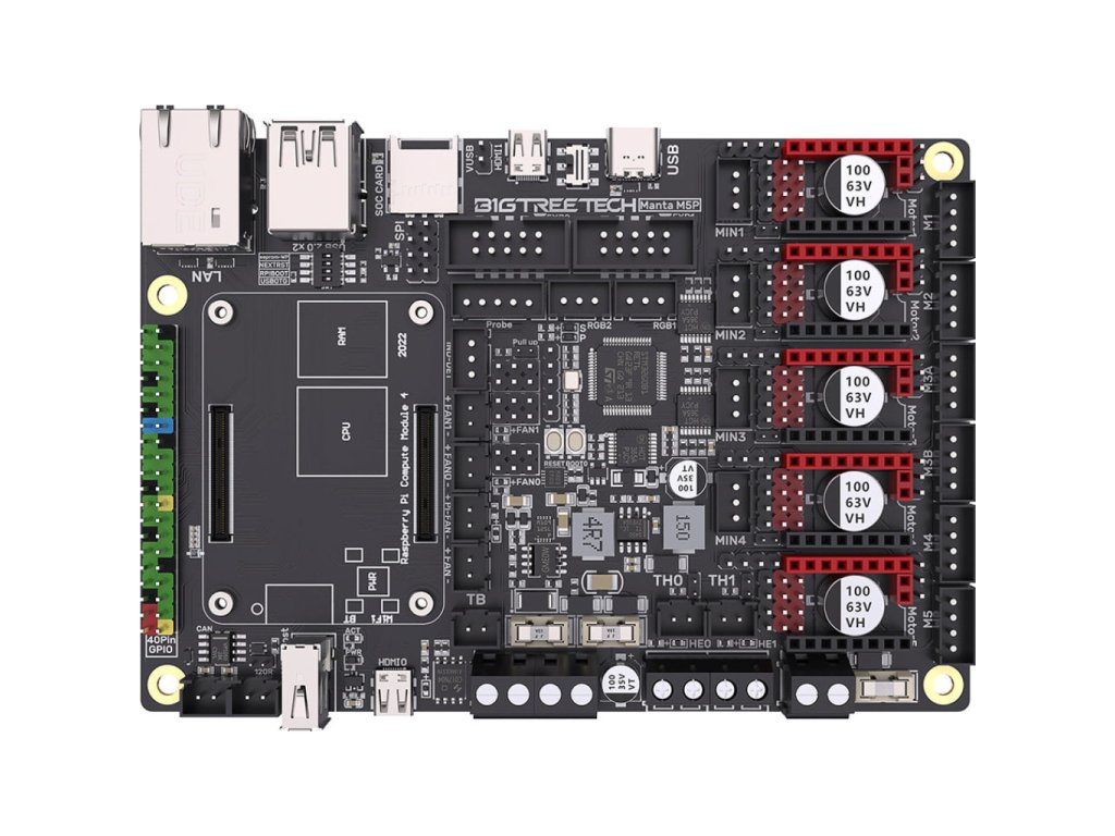 BIGTREETECH Manta M5P je 32bitová základní deska speciálně navržená pro provoz Klipperu. Deska umožňuje přímou instalaci BIGTREETECH CB1/Raspberry Pi CM4 pro spuštění Linuxu a Klipperu. Zvláštností této základní desky je, že má přímo integrované BTB-Header, které zákazníkům usnadňují volbu mezi CM4 nebo jiným řešením. Hlavní snahou je kompenzovat nedostatek desky Raspberry Pi CM4.