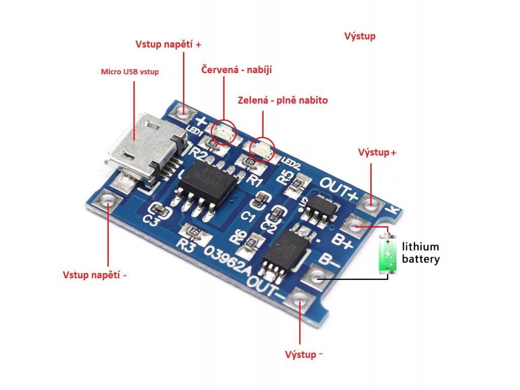 Balíček obsahuje jednu TP4056 USB-C nabíječku Li-Ion baterií s ochranou.