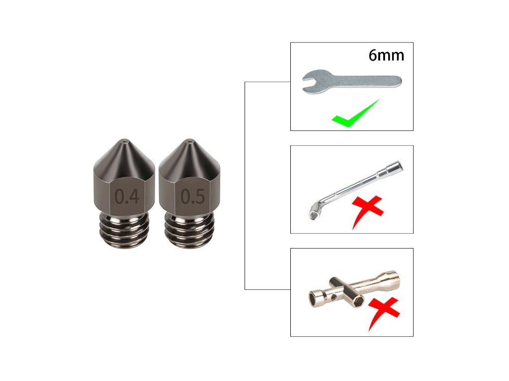 Tvrzená tryska je vhodná pro tisk abrazivních materiálů (dřevo, uhlíkové vlákna, třpytky, apod.), které tuto trysku neobrušují.